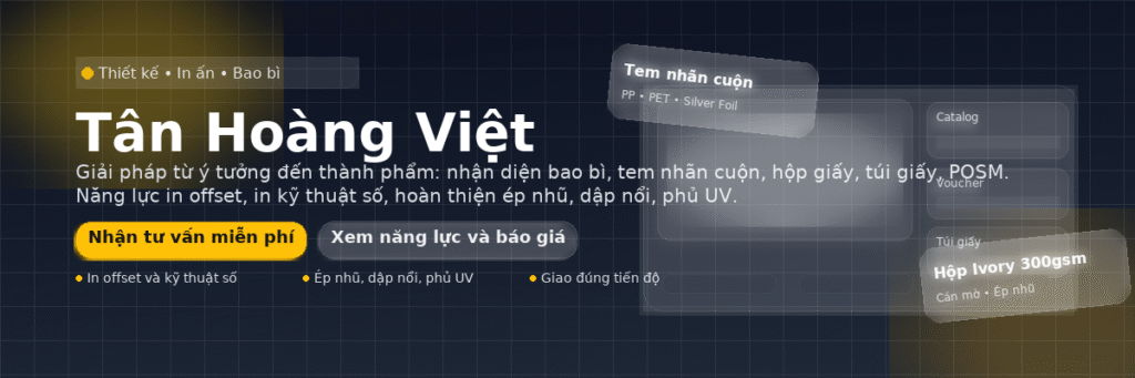 Tân Hoàng Việt là đối tác đáng tin cậy hàng đầu trong lĩnh vực cung cấp các giải pháp in ấn trên giấy bao bì và các ấn phẩm quảng cáo . Với hơn 10 năm kinh nghiệm, chúng tôi tự hào mang đến sự hoàn hảo trong từng ấn phẩm, từ những chi tiết nhỏ nhất. Chúng tôi chuyên sâu trong việc in ấn tài liệu văn phòng (như catalogue, brochure, danh thiếp), ấn phẩm marketing (như poster, tờ rơi), và các loại bao bì, tem nhãn đặc thù. Sở hữu hệ thống máy móc hiện đại, công nghệ offset và kỹ thuật số tiên tiến, cùng đội ngũ kỹ thuật viên tay nghề cao, chúng tôi cam kết đáp ứng mọi yêu cầu về số lượng, độ phức tạp và thời gian giao hàng. Tân Hoàng Việt không chỉ đơn thuần là in ấn; chúng tôi còn cung cấp dịch vụ tư vấn thiết kế, quảng cáo sự kiện, phù hợp nhất để đảm bảo thông điệp và hình ảnh thương hiệu của khách hàng được truyền tải một cách ấn tượng và hiệu quả nhất. Chất lượng, tốc độ và chi phí cạnh tranh chính là những giá trị cốt lõi làm nên uy tín của chúng tôi.