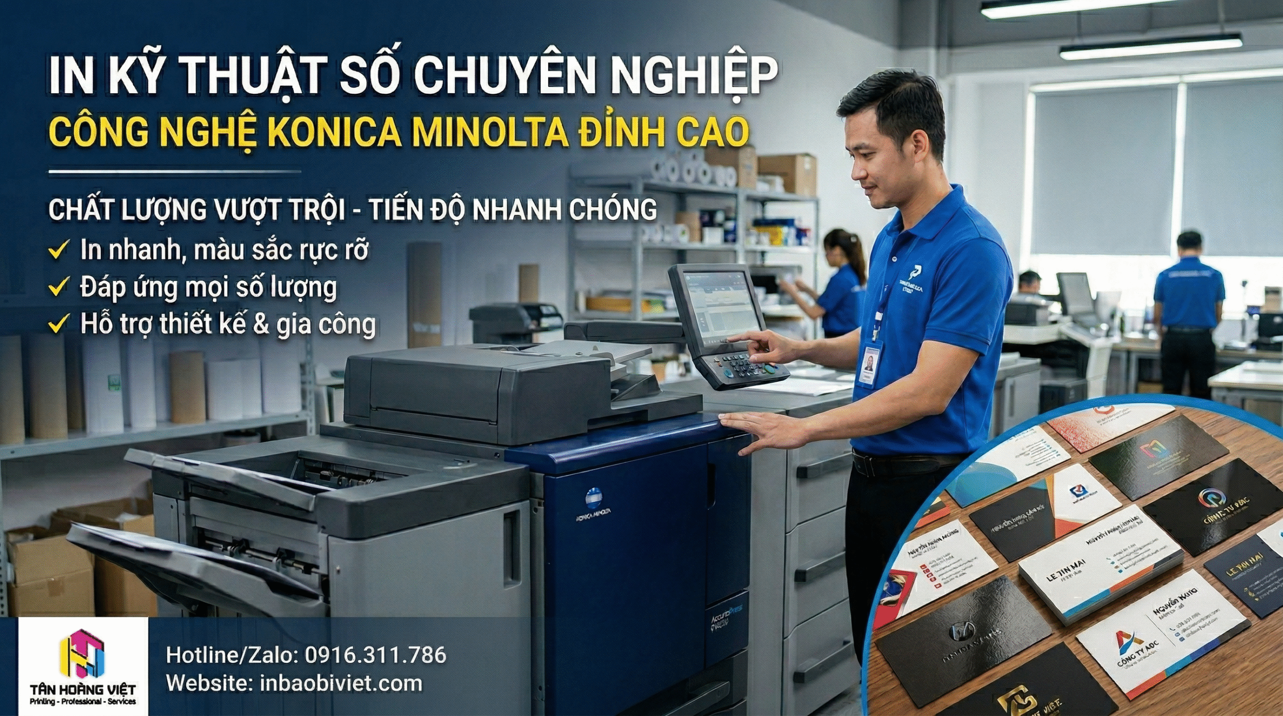 Tân Hoàng Việt đầu tư mạnh vào các máy in hiện đại để mang đến chất lượng in danh thiếp tốt nhất. Chúng tôi cũng cung cấp dịch vụ hỗ trợ khách hàng tận tâm cho từng đơn hàng, bất kể giá trị lớn hay nhỏ.