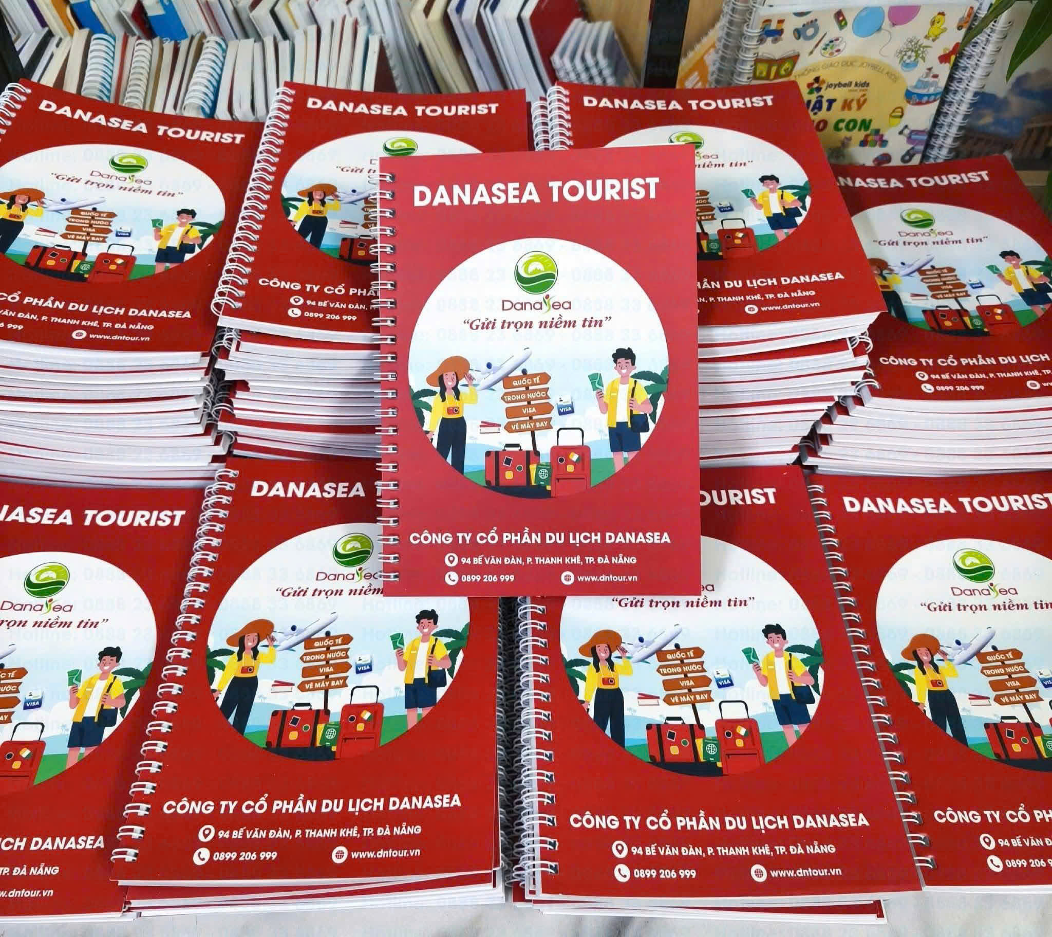 • Du Lịch & Dịch Vụ (Tourism): Các công ty lữ hành (như Danasea Tourist) tặng sổ tay cho khách hàng đi tour. Ruột sổ có thể in kèm các mẹo du lịch, trong khi QR code dẫn đến các chương trình khuyến mãi cho chuyến đi tiếp theo.