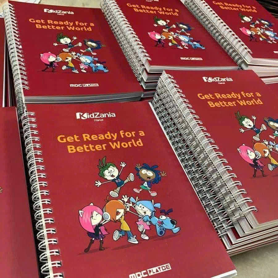 • Khu Vui Chơi & Giải Trí Trẻ Em: Các thương hiệu giáo trí (như Kidzania) in sổ tay với màu sắc rực rỡ, nhân vật hoạt hình bắt mắt để bán làm đồ lưu niệm hoặc tặng kèm vé.